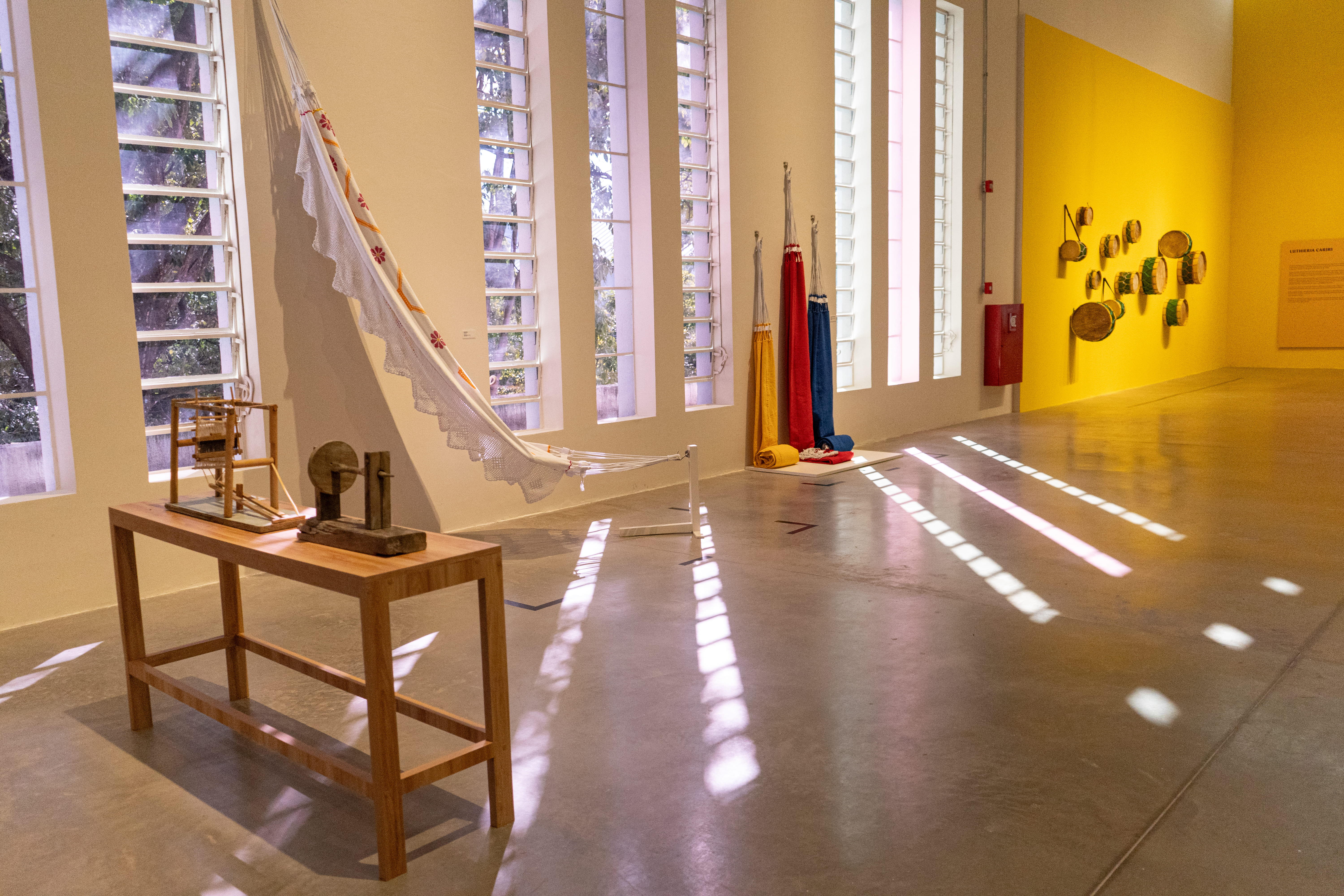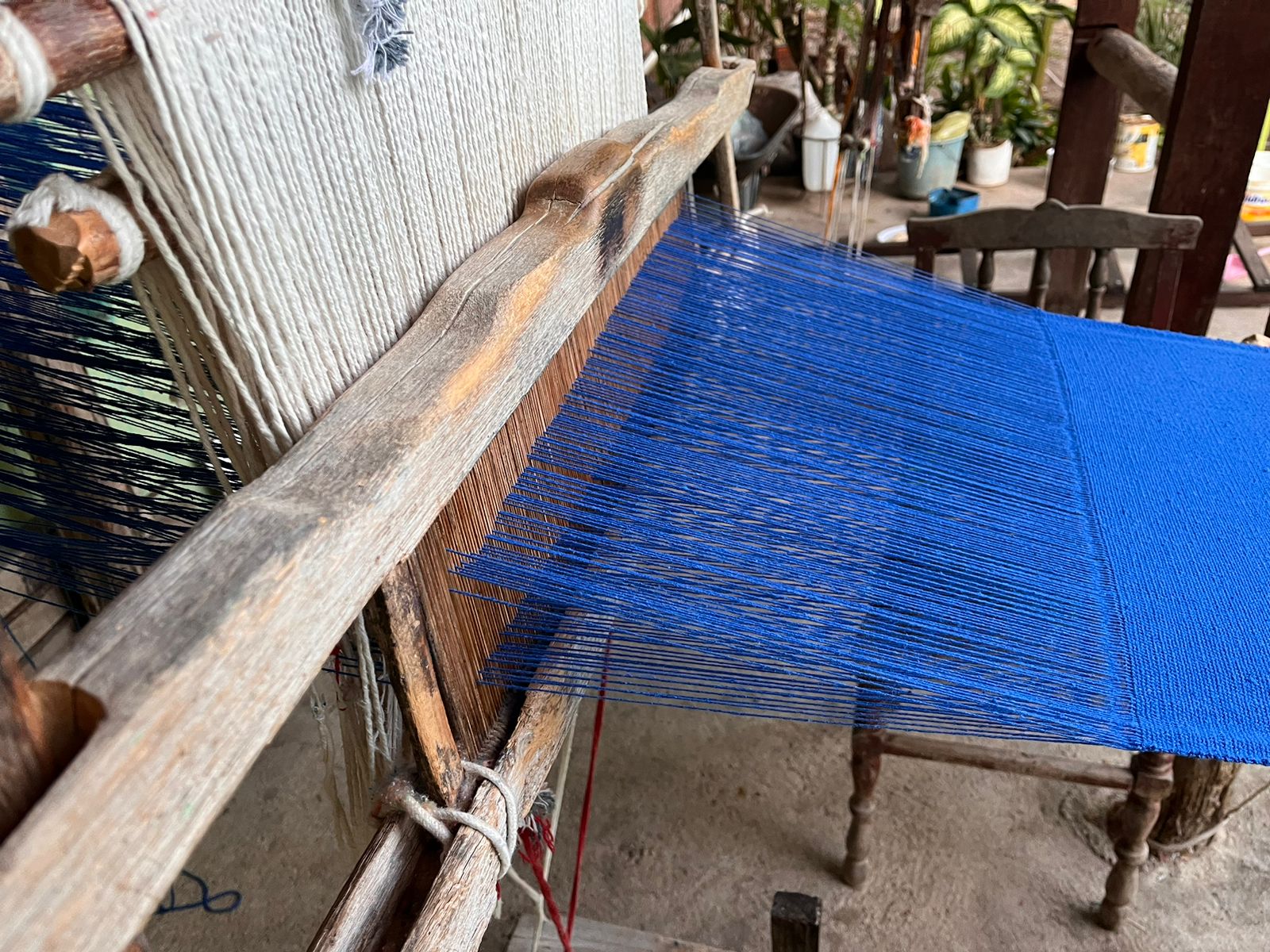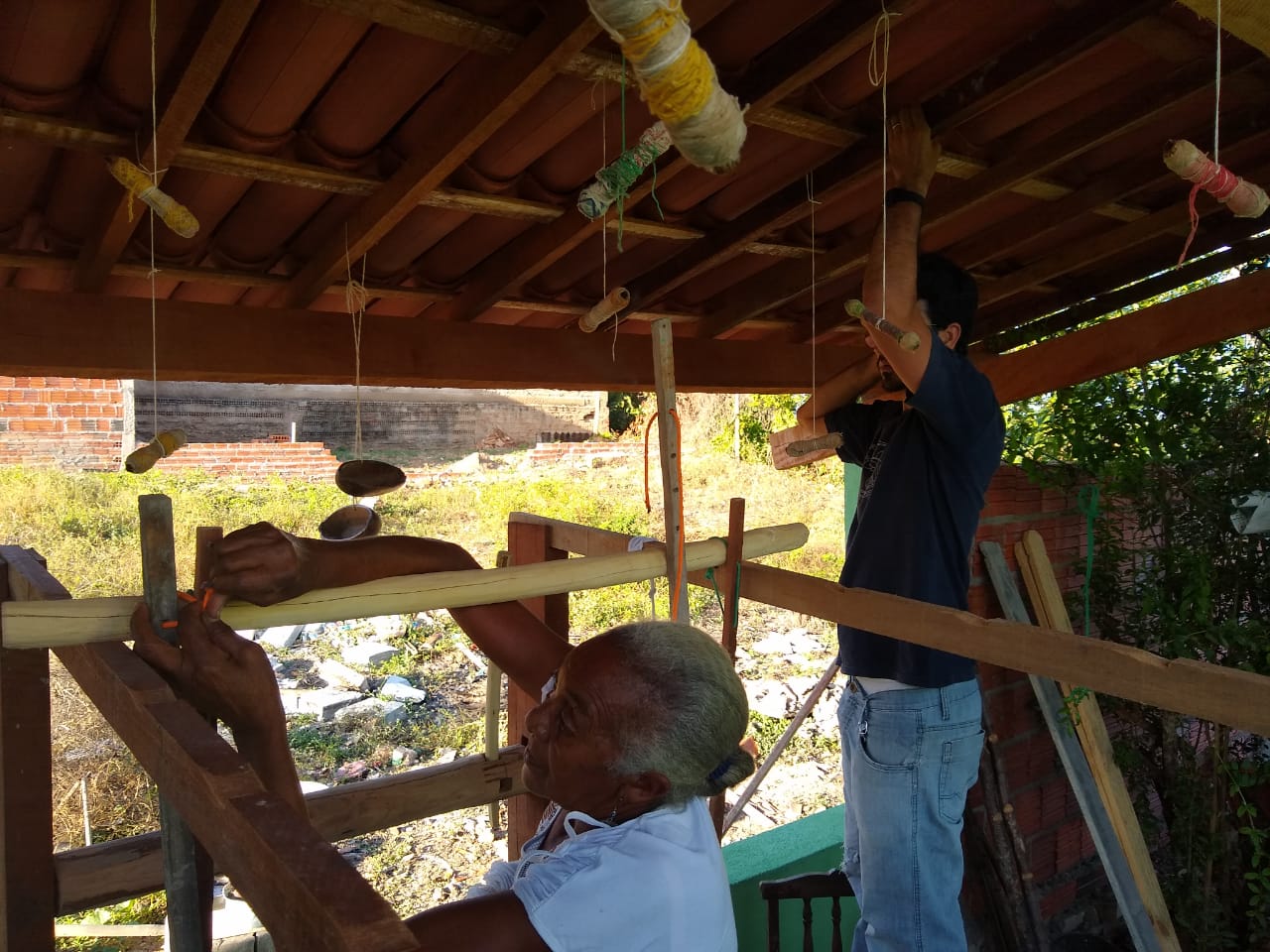 No quintal, repousam as partes do tear que tanto contribuíram para sua arte: liço, queixa, braço, orgo, pente, rasteira, cartel, canela e lançadeira. Com carinho e espontaneidade, Dinha brinca, afirmando que as madeiras de Ipê e Peroba Rosa que as compõem são mais antigas que suas próprias lembranças.