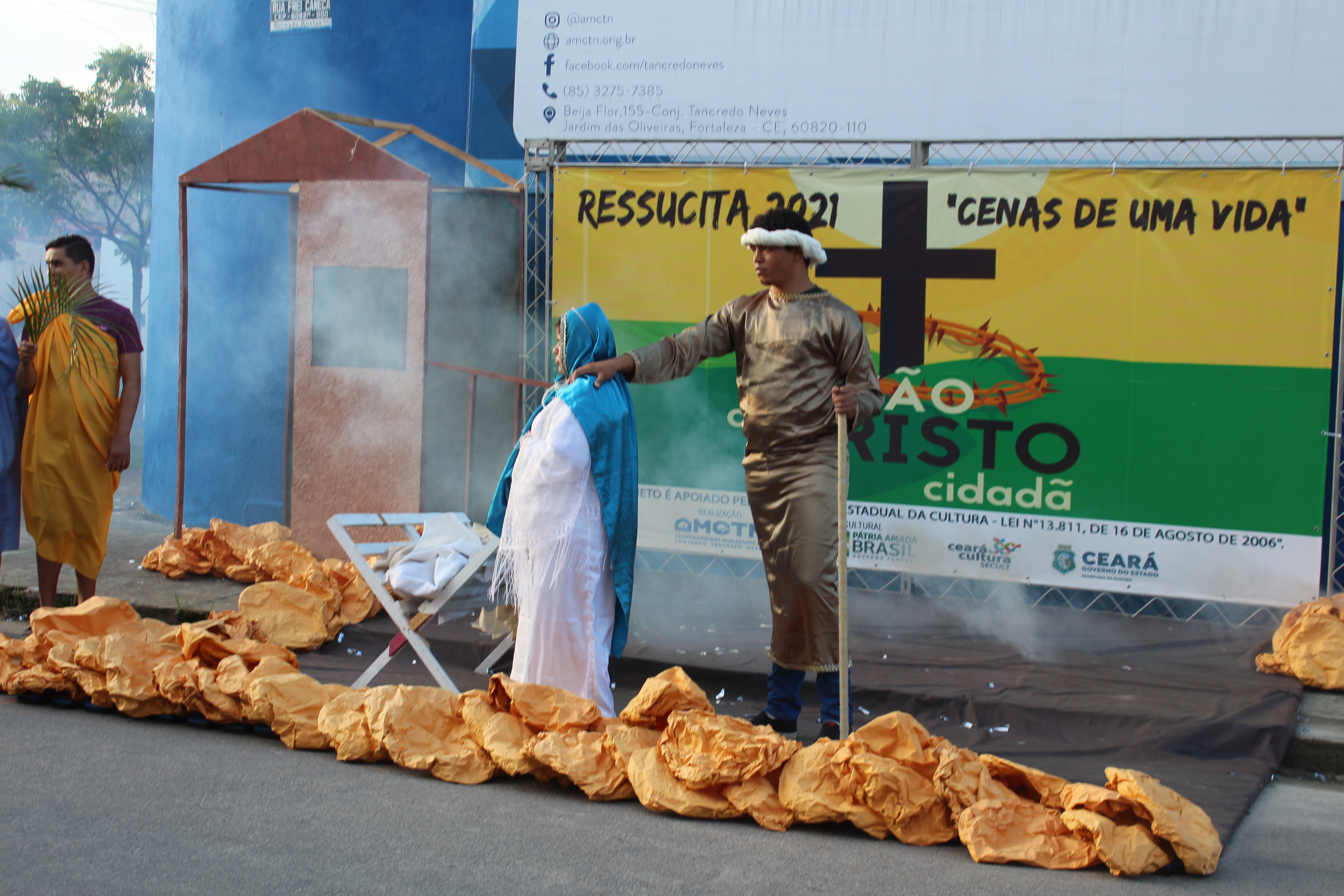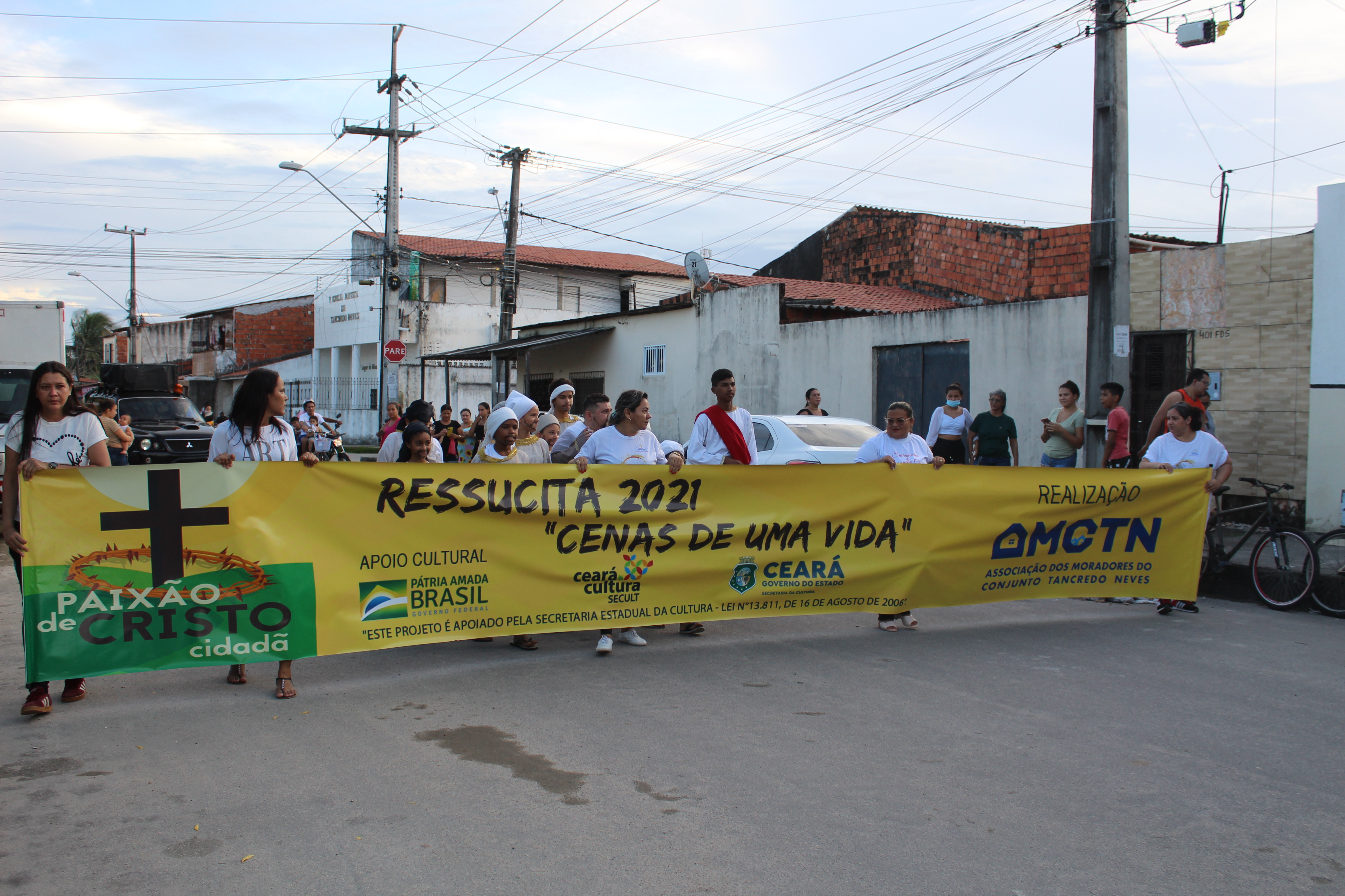 O Projeto Paixão de Cristo Pés no Chão é uma iniciativa cultural da AMCTN – Associação dos Moradores do Conjunto Tancredo Neves, que visa garantir espaço a crianças, adolescentes e jovens em situação de risco social.Utilizar o teatro popular nos garantiu resultados significativos, possuímos indicadores que depois das experiências diversas que esse projeto proporciona a suas crianças, adolescentes e jovens. Os mesmos se tornaram mais críticos e reflexivos com a sociedade em que vivem.