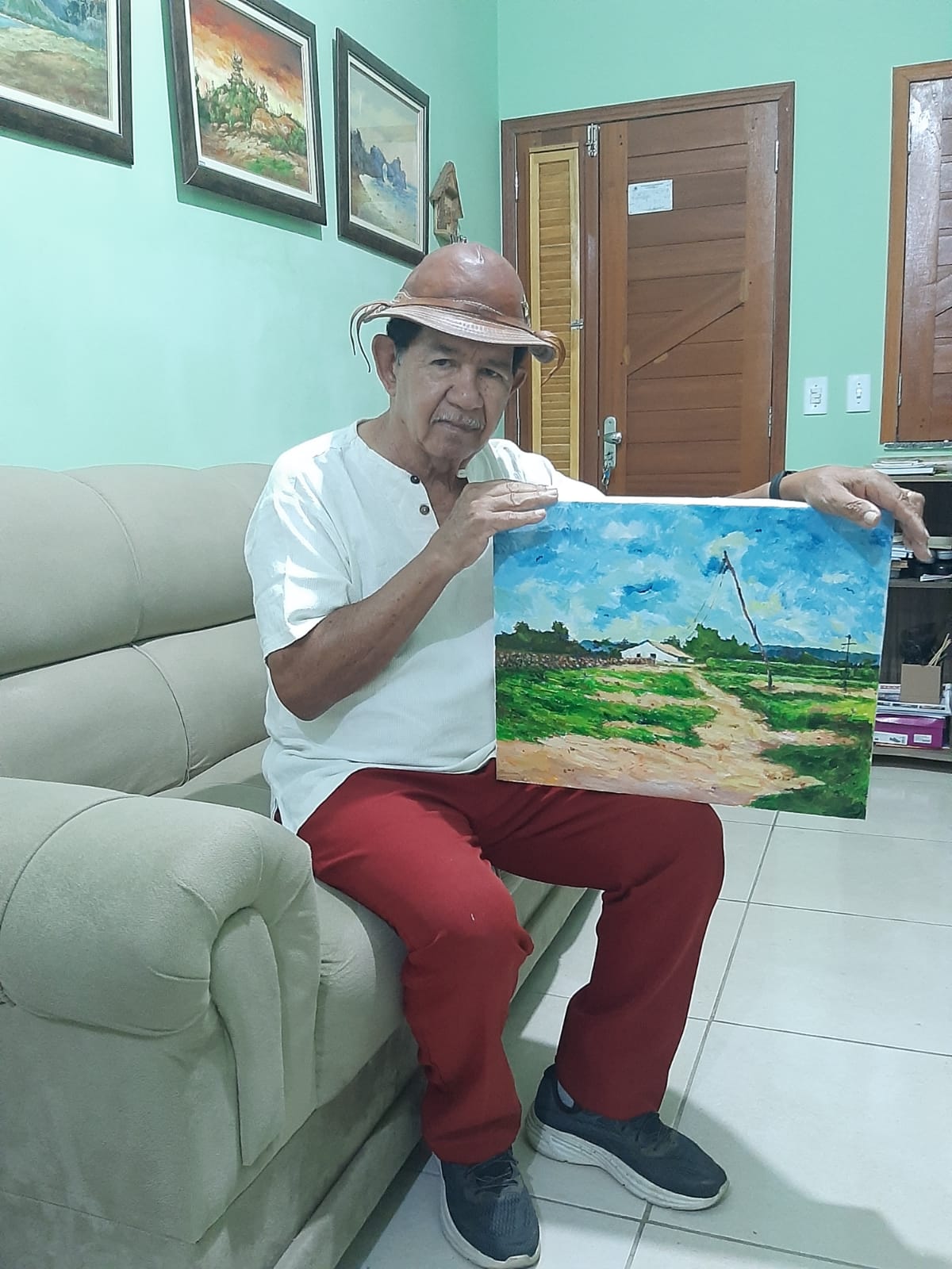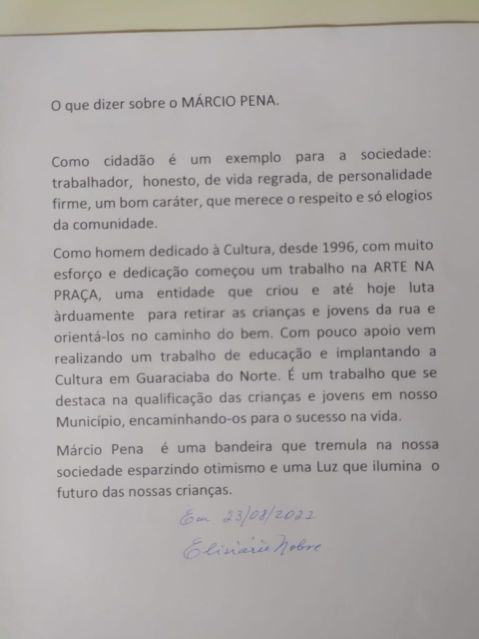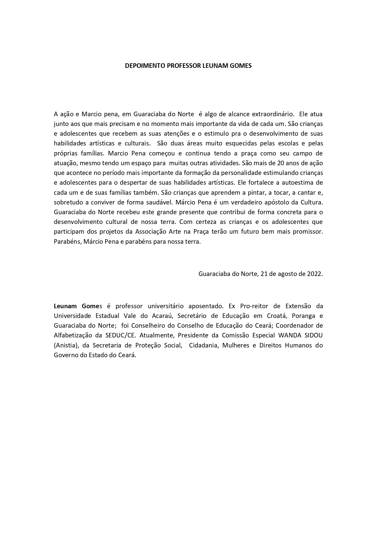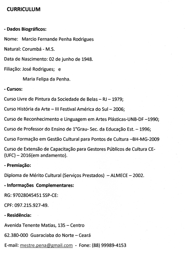 AUTOBIOGRAFIAMarcio Fernande Penha Rodrigues ( Marcio Pena), é artista plástico, artesão, produtor cultural, contador de histórias, gestor público de cultura e mestre griô da cultura oral (Reconhecido pelo Ministério da Cultura). Nascido no dia 02 de junho de 1948, em Corumbá – MS. Filho de Maria Felipa da Penha Rodrigues (in memória) e José Rodrigues (in memória) sendo o terceiro filho de sete irmãos. Casado com Maria Ximenes Alves Rodrigues, tendo os seguintes filhos: Marcio André de Oliveira Rodrigues (in memória); Míria de Oliveira Rodrigues e Raquel Pena Costa Rodrigues. Na Infância, ajudou seu pai na construção de canoas, remos, gamelas, ás margens dos rios Taquari e Miranda, esculpidas artesanalmente em troncos de árvores. Na adolescência, conheceu o italiano Carlos Marchiori que o ensinou a técnica de bico –de- pena, em desenhos de embarcações pequenas, tais como: chalana, batelão, canoa, etc. Em 1966, entrou para Marinha do Brasil (CFN), indo servir no Rio de Janeiro, prestando serviço durante 30 anos. Em 1995, entrou para a Reserva da Marinha. Em 1979, fez o curso livre de pintura Sociedade Brasileira de Belas Artes (SBBA – RJ), tendo como mestre o pintor italiano Antenor Finatti. No ano 1990, faz o curso de extensão de Reconhecimento e Linguagem em Artes Plásticas (UNB)- DF. No ano de 1991, ganhou “medalha de ouro” no Salão Brasília – Marinha, e como Prêmio viaja à Antártida em 1992, (tornando - se o 2° pintor brasileiro a pintar “in loco” o continente branco). Em março de 1996, veio residir com a família em Guaraciaba do Norte – Ce. Em julho de 1996, fundou o Projeto Arte na Praça (PAP). Em 2002, recebeu o Diploma de Mérito Cultural (serviços prestados) Academia de Letras Municipais do Estado do Ceará (ALMECE). Em 2004, recebeu o título de Cidadania Guaraciabense, outorgado pela Câmara Municipal. No ano de 2006, fez o Curso de História da Arte – (III Festival América do Sul) - Corumbá – MS. Em 2008, recebeu do Ministério da Cultura (MinC), o reconhecimento de mestre griô da Cultura Popular Oral. Em 2016, fez o Curso de Extensão de Capacitação para Gestores Públicos de Cultura do Ceará - (UFC). Em 2016 fez o curso de Contação de Histórias - Instituto Nordeste Cidadania (INEC)- Fortaleza - CE. Em 2017, concluiu o curso de extensão para Gestores Públicos de Cultura – (UFC), recebeu o troféu do Festival União da Ibiapaba – (FUI), e recebeu a comenda Antônio Ribeiro Zaranza, do Comitê da Bacia Hidrográfica da serra da Ibiapaba – COGERH – Governo do Estado do Ceará. recebeu a medalha José Maria Melo, concedida pela Câmara de Vereadores do Município-2020