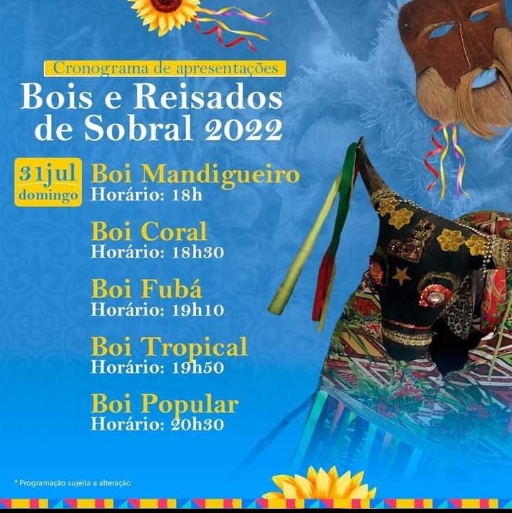 CHAMADA PÚBLICA PARA APOIO E INCENTIVO DA TRADIÇÃO DE GRUPOS DE BOIS E REISADOS DE SOBRAL, cujo objetivo é apoiar grupos que irão se apresentar durante as atividades do ciclo festivo de Bois e Reisados no ano de 2022, em conformidade com o artigo 2º da Lei Municipal n°1.244/2013.
