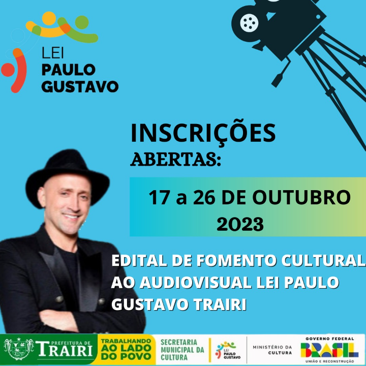 PREFEITURA MUNICIPAL DE TRAIRI, Ceará, por intermédio da Secretaria Municipal da Cultura, torna pública O Edital de Fomento Cultural ao Audiovisual – Lei Paulo Gustavo Trairi. Este Edital é realizado com recursos do Governo Federal repassados por meio da Lei Complementar nº 195/2022 - Lei Paulo Gustavo.