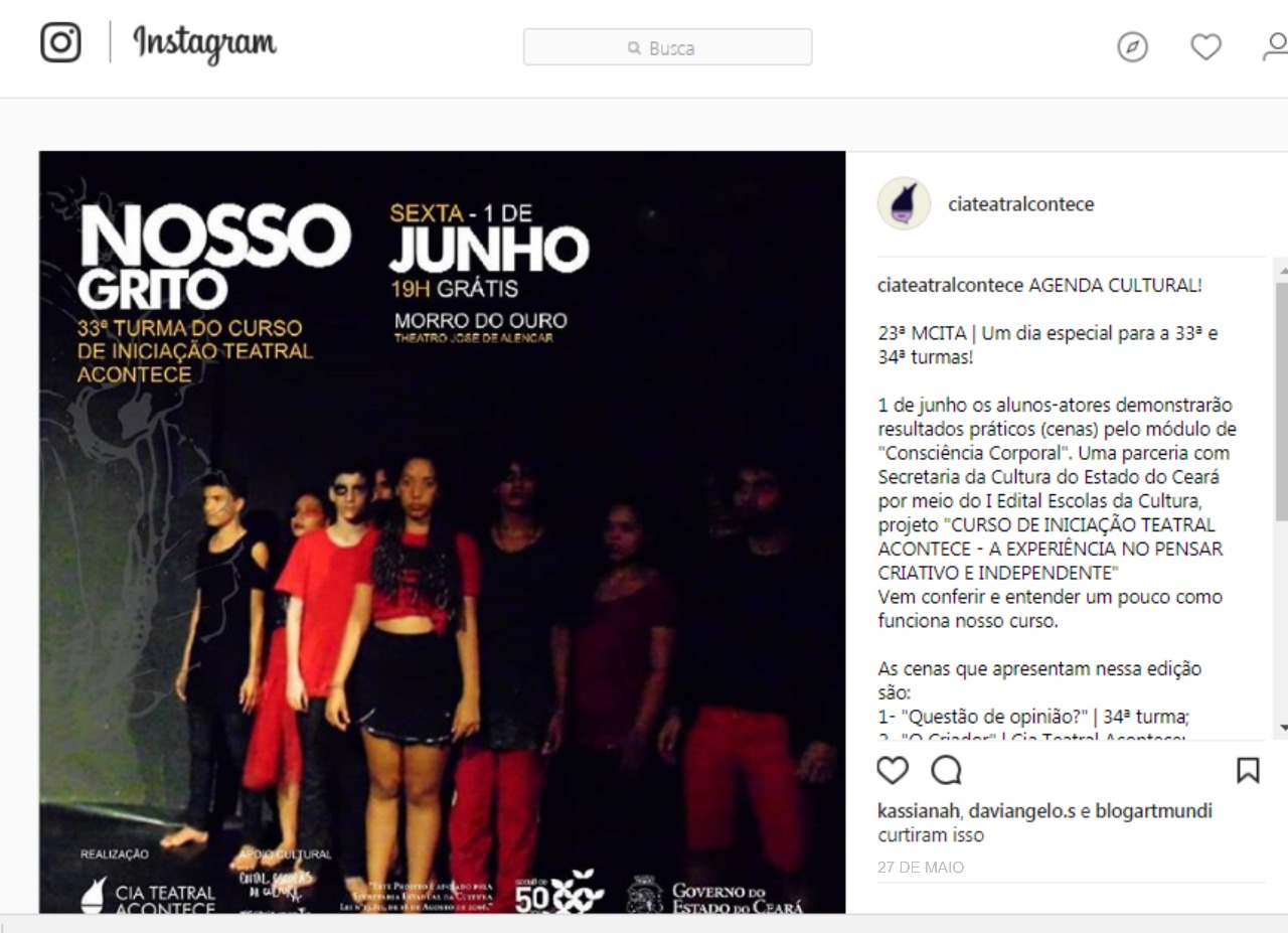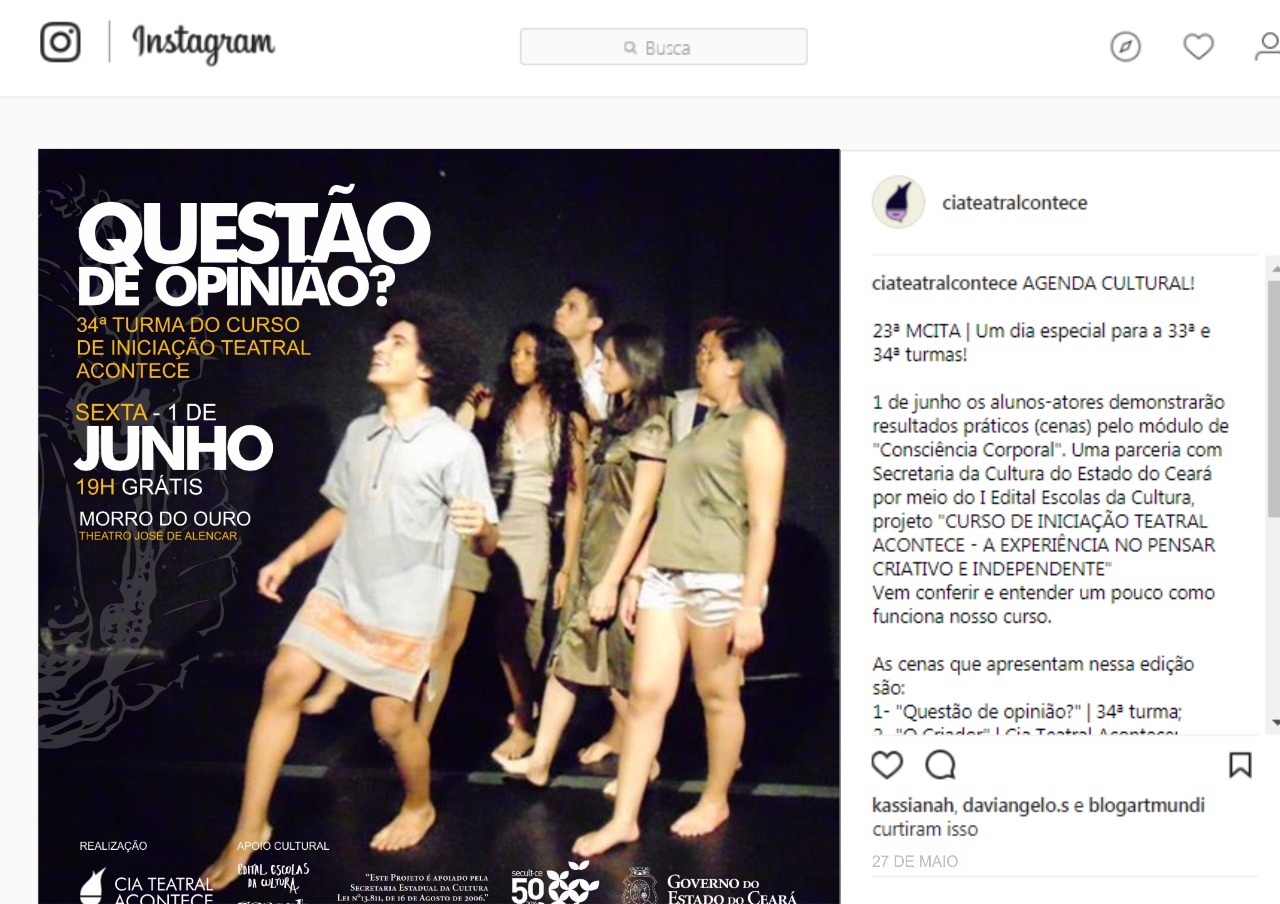• O Projeto Curso de Iniciação Teatral Acontece -A EXPERIÊNCIA NO PENSAR CRIATIVO E INDEPENDENTE é a continuidade das ações de formação da Cia Teatral Acontece, em atividade desde julho de 2002 na cidade de Fortaleza e municípios cearenses. Nestes quinze anos já foram formadas 31 turmas. Destaque para as cidades de Baturité, Pacajus, Horizonte, Apuiarés e Pires Ferreira.